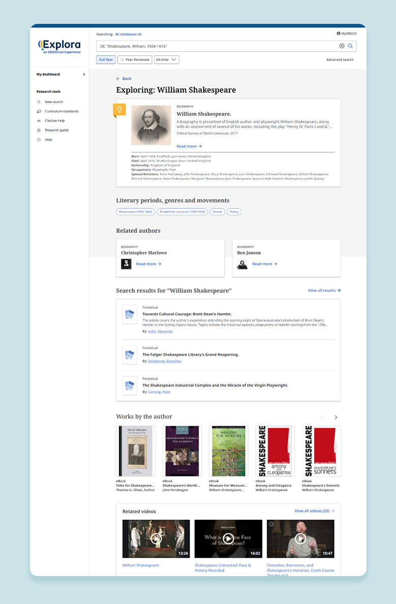 For example, when a user is researching Shakespeare’s Hamlet in Literary Reference Ultimate, the search results page displays a Smart Panel containing key information — author, characters, settings and literary themes — along with a link to a plot summary. Clicking the Explore Topic button takes the user to a Topic Discovery Page, which provides a curated collection of authoritative sources, including relevant articles, e-books, expert analyses and study guides.