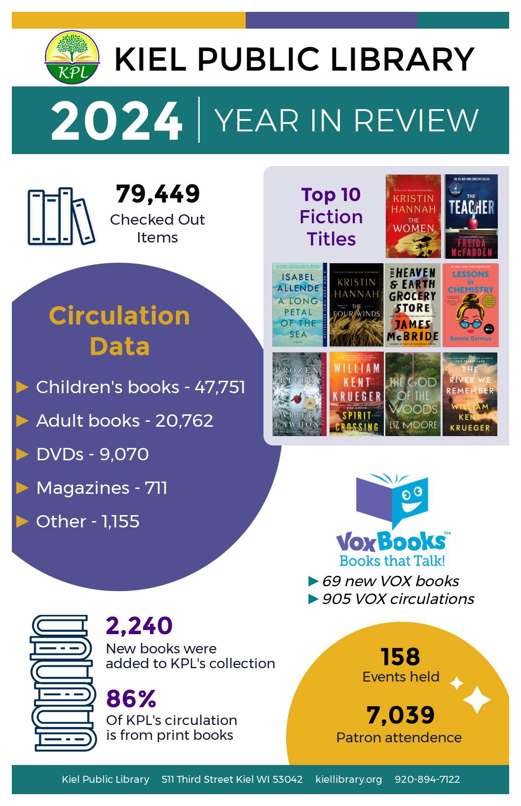 We love this example of the 2024 Year in Review infographic by Kiel Public Library in Wisconsin. They start with a very clear title, and we’re willing to bet they used their annual report as a source of this data.