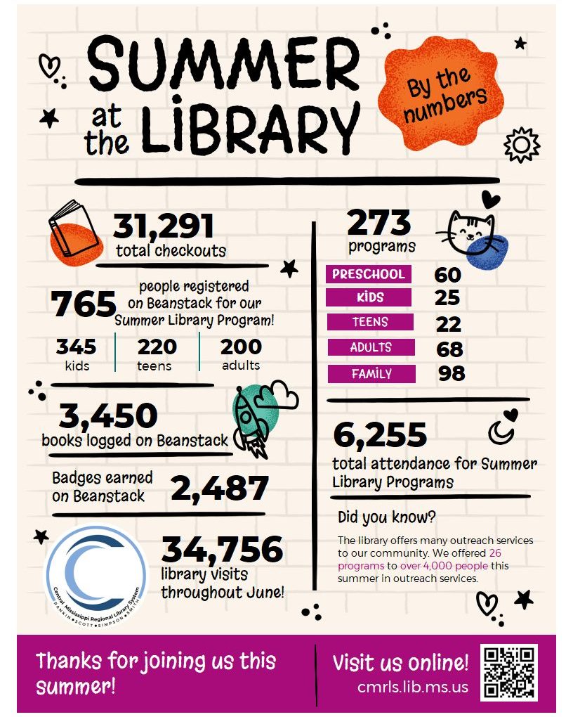 This recap of Central Mississippi Regional Library System's summer reading program in 2025 uses two fonts to great effect. The first font is handwritten and splashy looking (which looks great with the splashy graphics), and the second font is a highly readable sans serif.