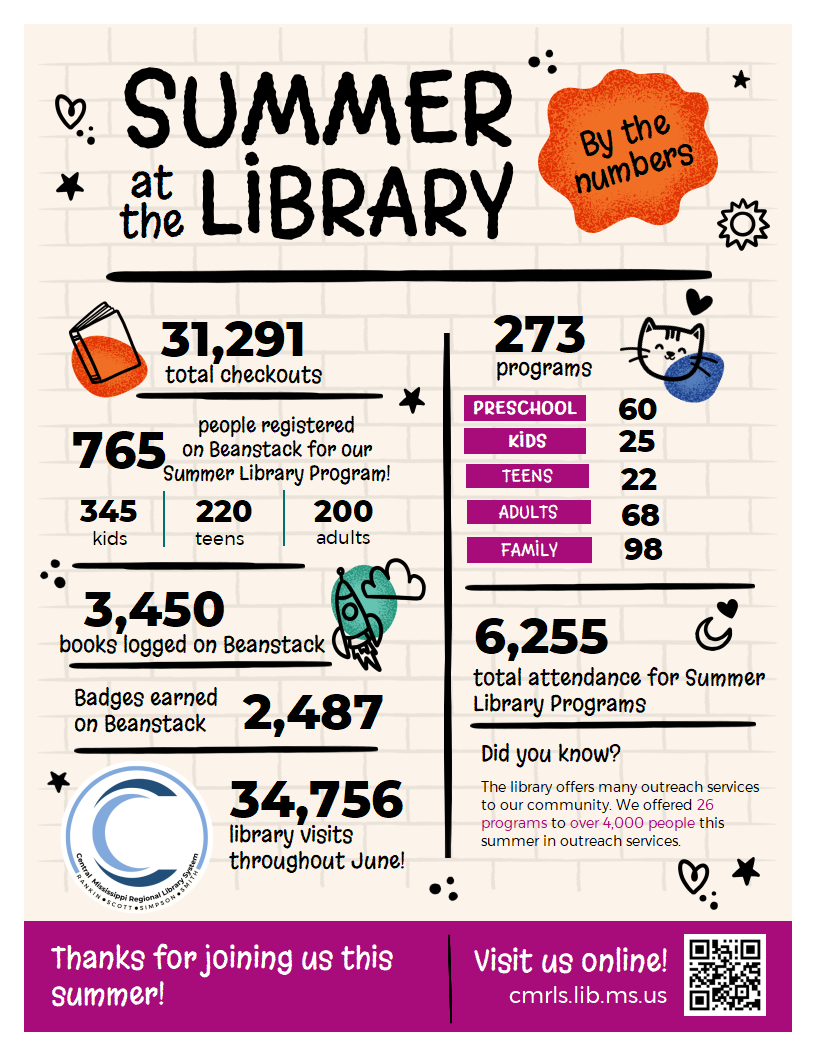 At the end of the summer, the Central Mississippi Regional Library System compiled all its stats into this colorful and fun template. All they had to do was add the numbers (well, after they did the math), and presto, they were ready to share the results of a successful summer with the community.