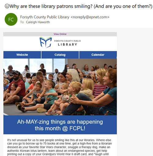 Best email subject line: Forsyth County Public Library has a lot of goodness packed into this monthly newsletter, and they get recipients to open it using an irresistible subject line, complete with an emoji!