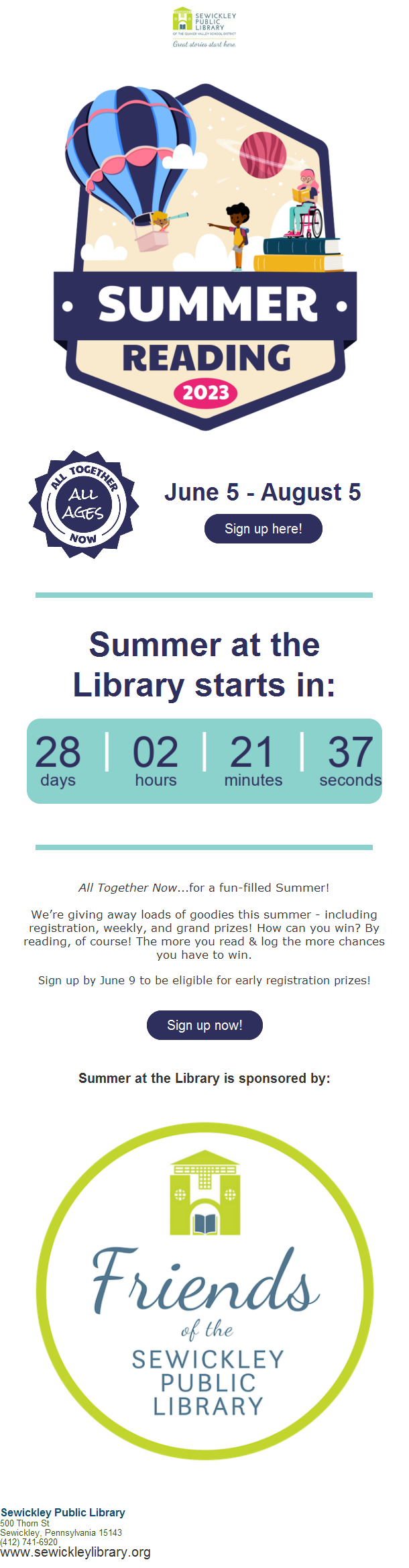 Similarly, Sewickley Public Library used LibraryAware to send this excitement-building email for their summer reading program. It also has a section thanking their sponsor — a very smart idea!
