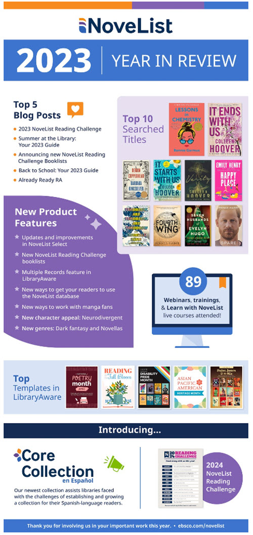 Can you believe it’s that time again? We can’t. 2023 was another eventful year. There’s no better way to encapsulate all that happened than in an infographic (#MadeinLibraryAware, of course). In case you missed it, this is a snapshot of how you and your patrons used NoveList this year, including the most searched titles plus product updates, blog posts, and templates you loved.