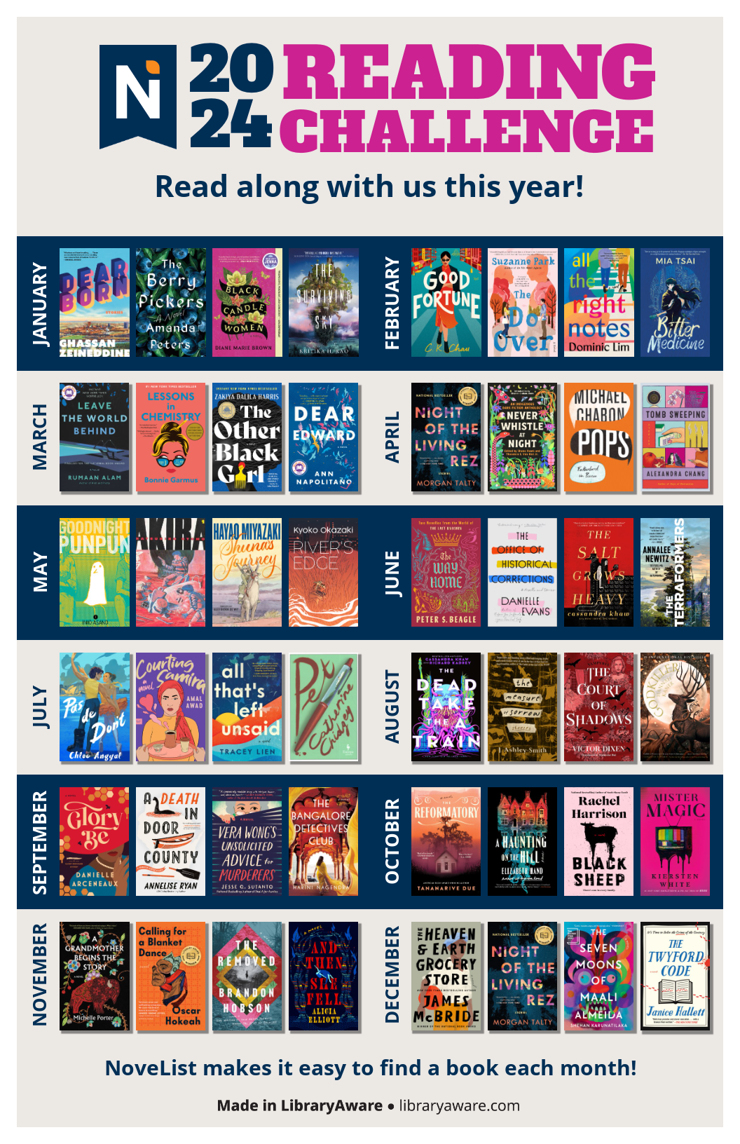 As we approach the end of 2023, it's time to prepare for the new year by announcing the 2024 NoveList Reading Challenge. Many of us get into a reading rut and only realize it once we change up what we're reading. We're all about trying new things to broaden our reading habits. So, to help you easily add variety to your TBR, we're continuing our tradition of giving you a challenge prompt for each month of the year.