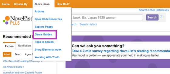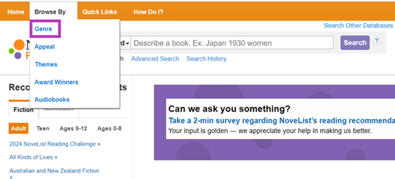 Readers love genre fiction, and there are two resources I've always loved to use in NoveList to learn about genres, particularly those I don't read as often. First is the Genre Browse page, which lets you see new and popular books for all ages in different genres. Go to the top navigation bar, select Browse By, and then Genre. Once you're on the Genre Browse page, you can choose the audience level and genre to browse from the drop-down menu. When I worked in public libraries, I took some time each month to browse through the genres to get a sense of what new books readers might be interested in.