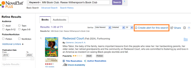 Let's say you want to know the latest celebrity book club pick. Using Media Mentions, you can perform a search for Book Club: Reese Witherspoon's Book Club. Then, from the search results page, you can create an alert for that search. With search alerts, you'll be notified when new books that meet your criteria are added right to your inbox!