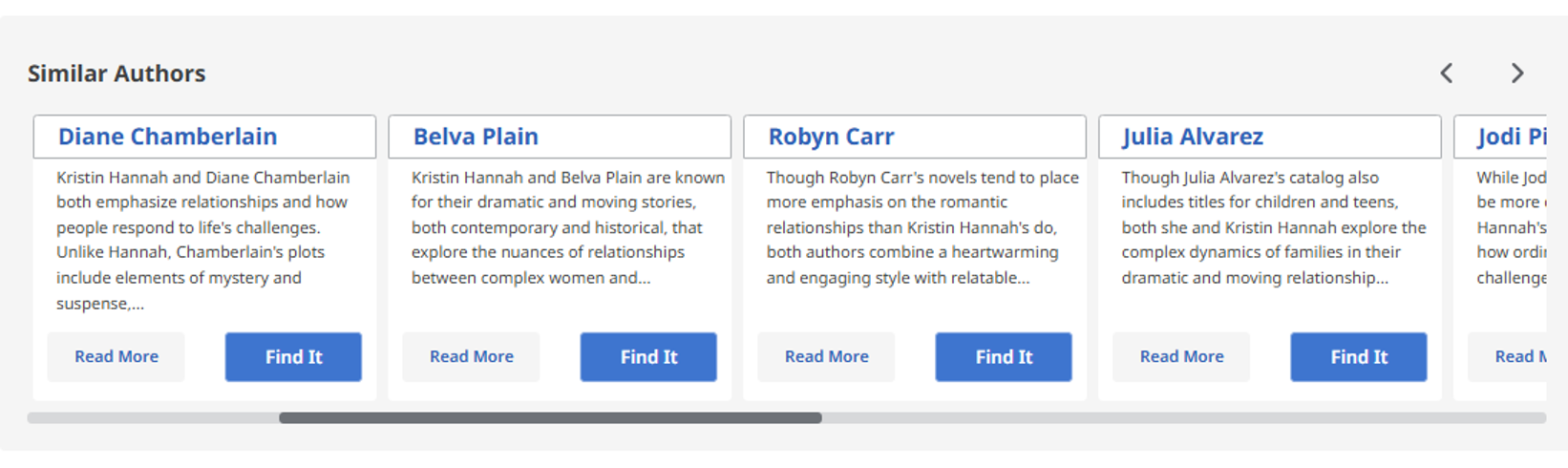 Maybe the next patron you talk to tells you, “I really like Kristin Hannah, but I’ve read all of her historical fiction books.”