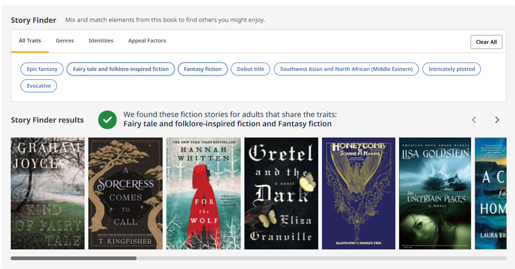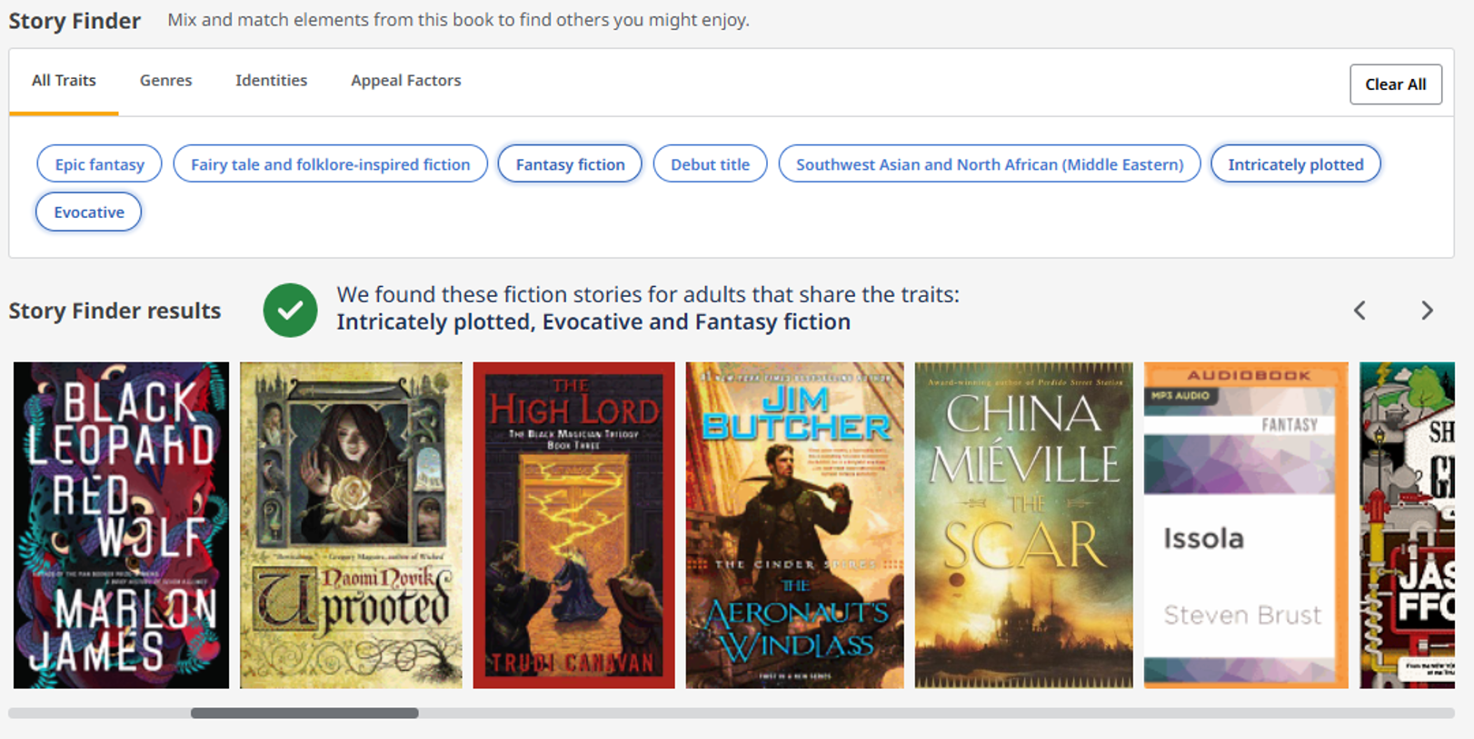 If a reader tells you, “I just LOVE the Sandsea Trilogy by Chelsea Abdullah and can hardly wait till the third book. What am I supposed to read in the meantime?” You can use NoveList Select’s Story Finder to match your patron with books tailored just for them. Even if you have never heard of the Sandsea Trilogy, you will find a whole set of vocabulary, right in your catalog, that you can use to confidently make informed recommendations.