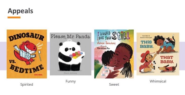 Appeals help readers determine why they enjoy a book and whether a particular book will fit their style. You can use appeal to find books based on the type of character you like, the pacing or tone, or even the style of illustration. Toddlers may enjoy stories where the characters are Mischievous, Spirited, Sympathetic, or Anthropomorphic.