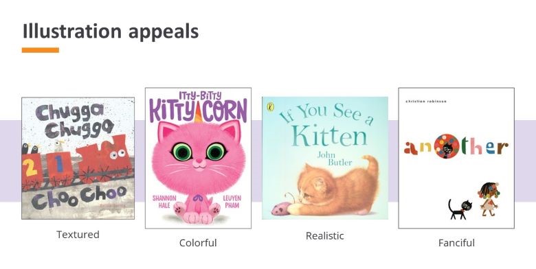 Picture book illustrations are a crucial set of appeals for young readers. The pictures are often what draws them into the story! Picture book illustrations can be Textured, Lavish, or Realistic. If you’re looking for books to share with a group, such as a storytime or daycare class, books with Big and bold or Colorful illustrations work well whereas Detailed illustrations can be great for poring over pictures in a one-on-one reading. You may lean towards one type of illustration or another, based on how or where the books will be shared.