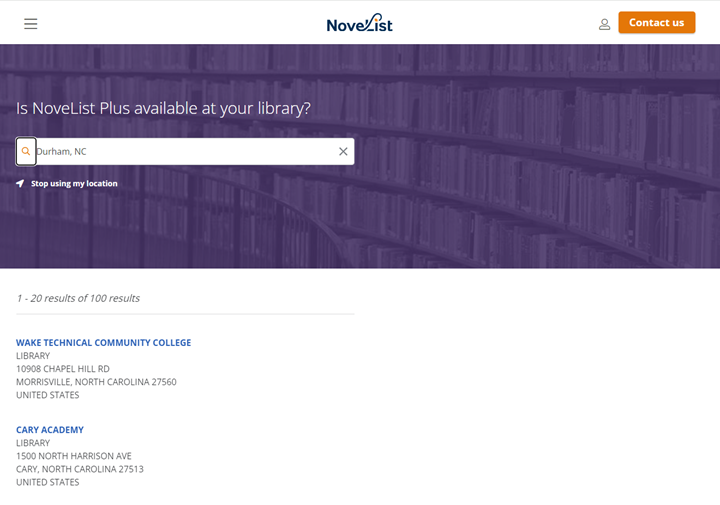 Your search will return a list of the libraries, schools, and other organizations in the area, including yours, that have active NoveList Plus subscriptions.