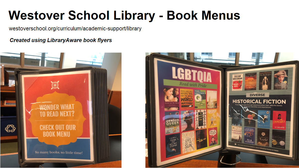 Get creative with timely displays that tie into pop culture like this page-to-screen display from Newmarket Public Library or seasonal suggestions like Mercer County Library Systems’ spring gardening display or Bullitt County Public Library’s blind date with a book display. You could even create a book menu like Westover School Library did.