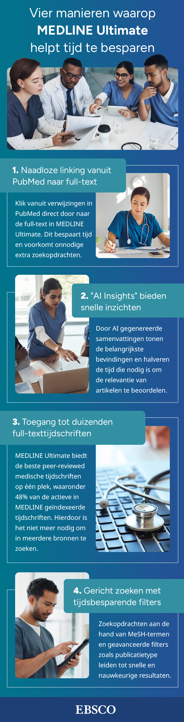 Vier manieren waarop MEDLINE Ultimate helpt tijd te besparen Infographic | 13 januari 2026 Ontdek vier manieren waarop MEDLINE Ultimate medische professionals en studenten helpt tijd te besparen bij onderzoek en onderwijs. Ontdek de voordelen van MEDLINE Ultimate. Lees meer You might also be interested in EBSCO-oplossingen voor academische bibliotheken Bekijk document 6 redenen om te kiezen voor Business Source Ultimate Bekijk overzicht PressReader voor ziekenhuizen en klinieken Bekijk overzicht