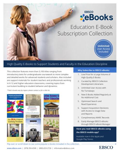 EBSCO eBooks Education Collection Flyer High-quality e-books to support students and faculty in the education discipline Download You might also be interested in EBSCO Book Acquisition Feature Crosswalk View solution brief School Library Solutions from EBSCO View market guide Public Library Solutions from EBSCO View market guide