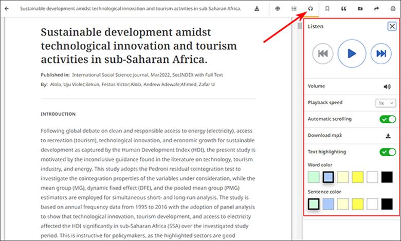 EBSCO'nun Text-to-Speech özelliği, zorlanan okuyuculara, işitsel öğrenenlere ve İngilizce dil yeterliliğini geliştirenlere yardımcı olur. Makaleleri ve pasajları yüksek sesle okuyan metinden sese özelliği, öğretmenlere alternatif bir içerik sunma seçeneği de sağlar.